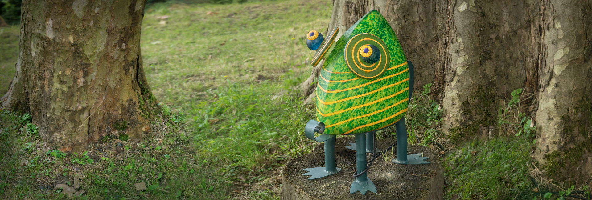This creature has crawled from his home in the jungle into the vines of your home. This colorful vase captures the light perfectly, emitting a fluorescent green hue. Enjoy him as he is, or let him hold your favorite plants. His long tongue also makes him the perfect fly exterminator.