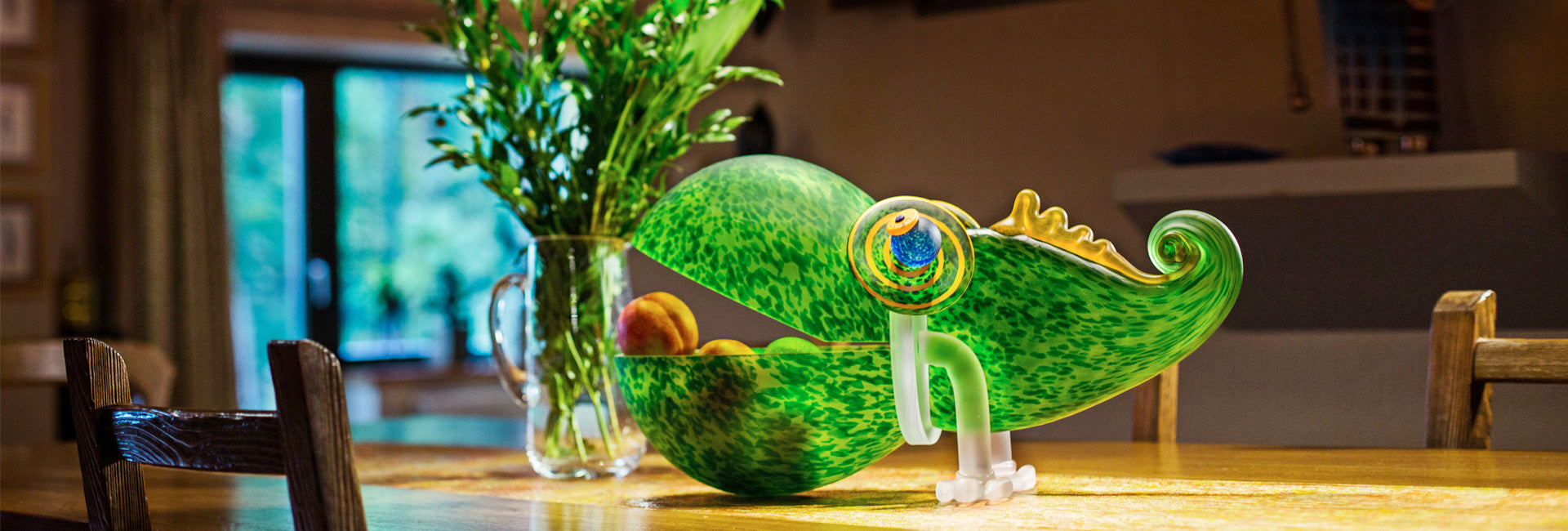 Like his big brother, our Chameleon Small Bowl is a charmer, a real dish. He could quite possibly bowl you over with his good looks. In spite of his handsome appearance, he’s never full of himself. He’ll leave that to you.