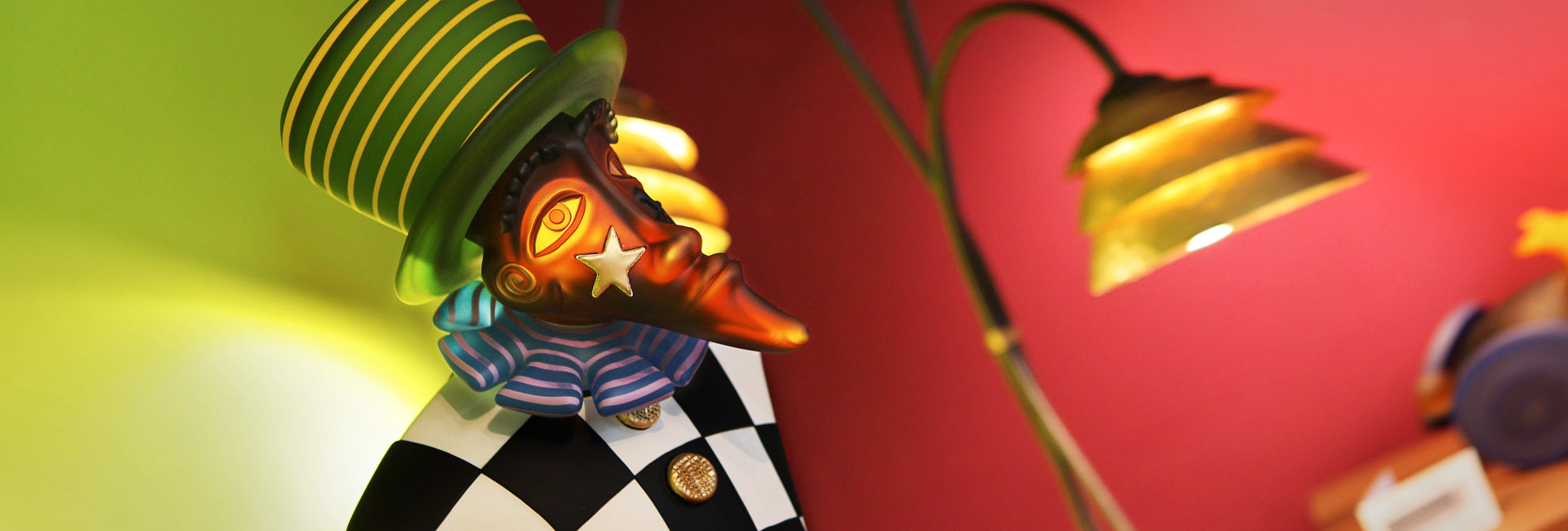 This large enigmatic face holds many stories and secrets; you just need to know what to look for. Fantastic shades of blue, pink, red, and green decorate this head, and each piece is unique to the rest in the collection.