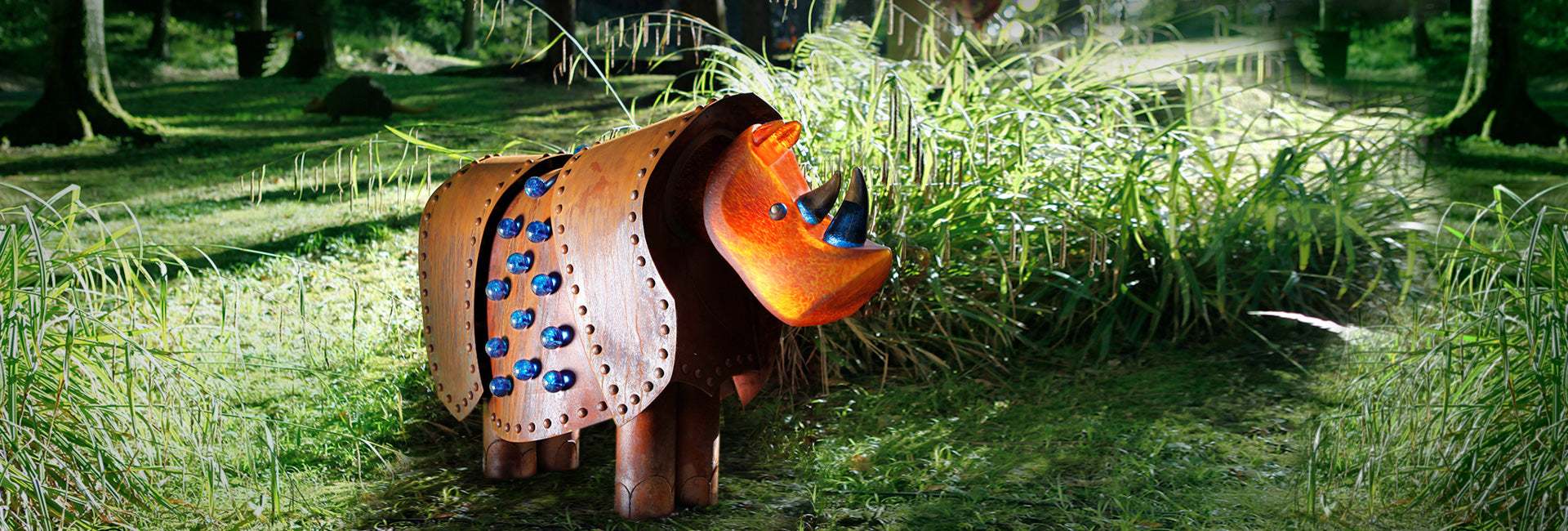 Rhinos have existed for millions of years as the guardians of African plains. This piece is a representation of the natural creature with heavy metal armored plates to protect it with delicate components throughout its body glowing with life.
