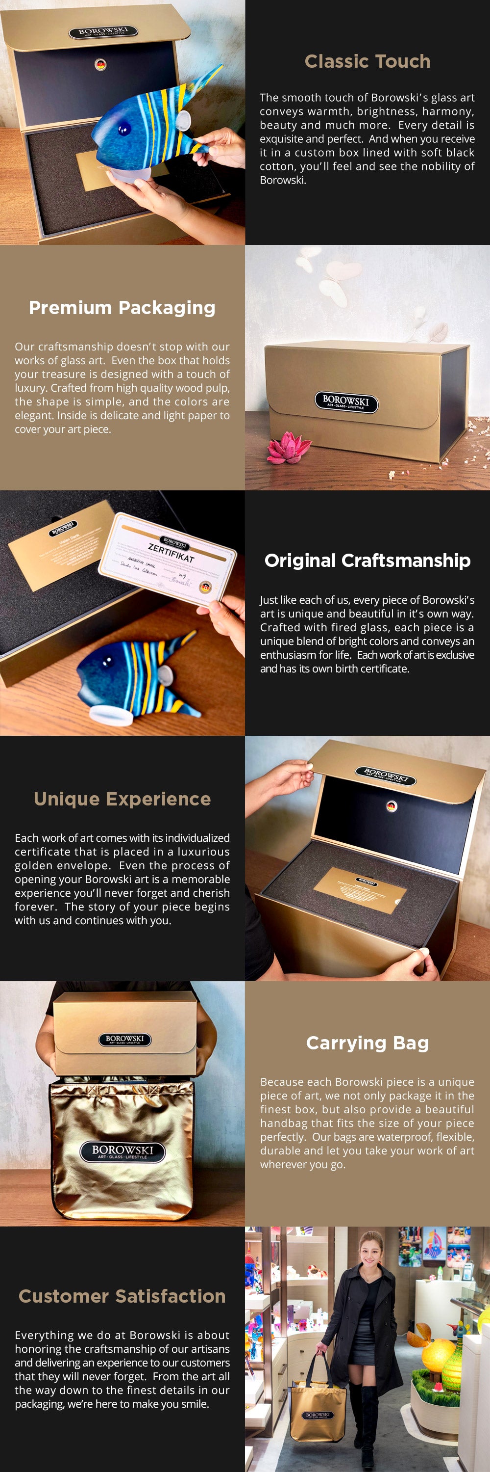 All the artworks are designed and produced by Borowski artists. Just like each of us, every piece of Borowski’s art is unique and beautiful in its own way. Crafted with fired glass, each piece is a unique blend of bright colors and conveys an enthusiasm for life. Each work of art is exclusive and has its own birth certificate.