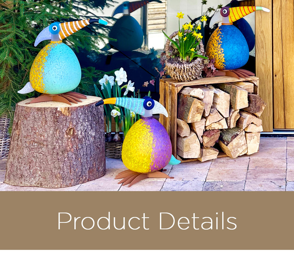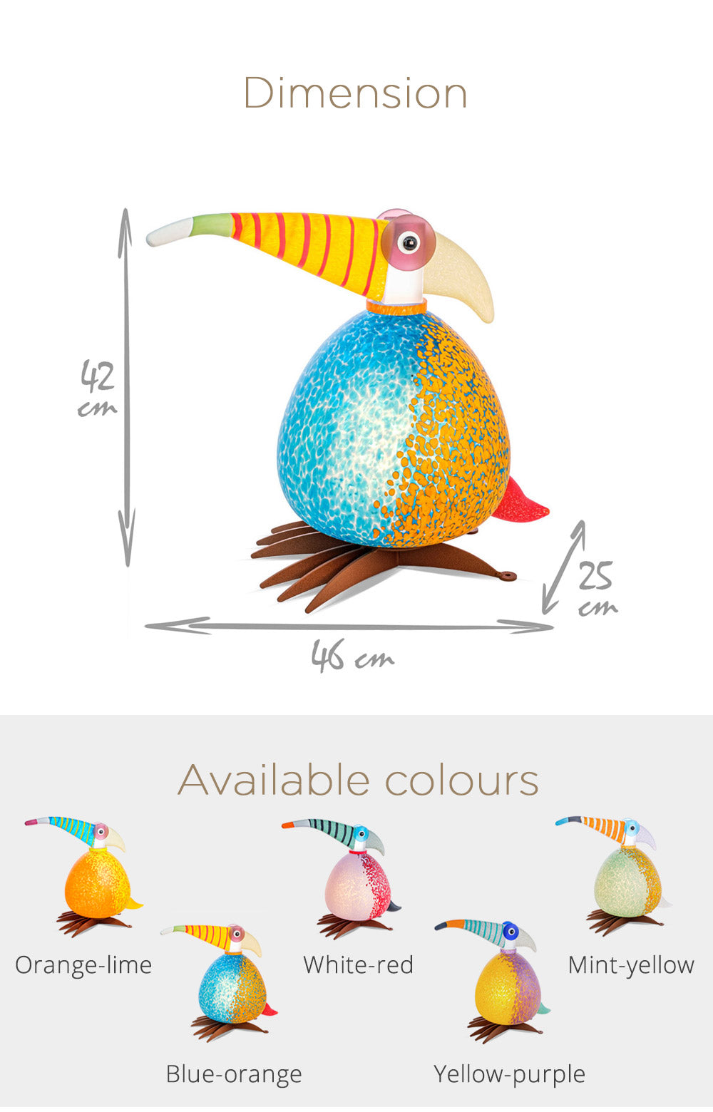 TUKANO is a hand-blown glass toucan that adds a pop of fun and color to any garden or home. He spreads happiness wherever he goes, and with a light inside, he makes the perfect lighting feature for both indoor and outdoor spaces. He’s a cheerful art piece everyone will love.